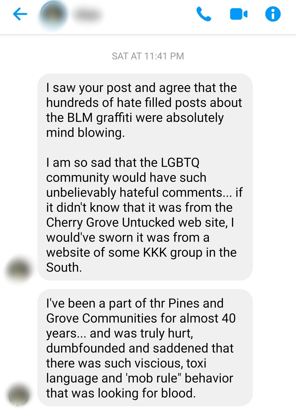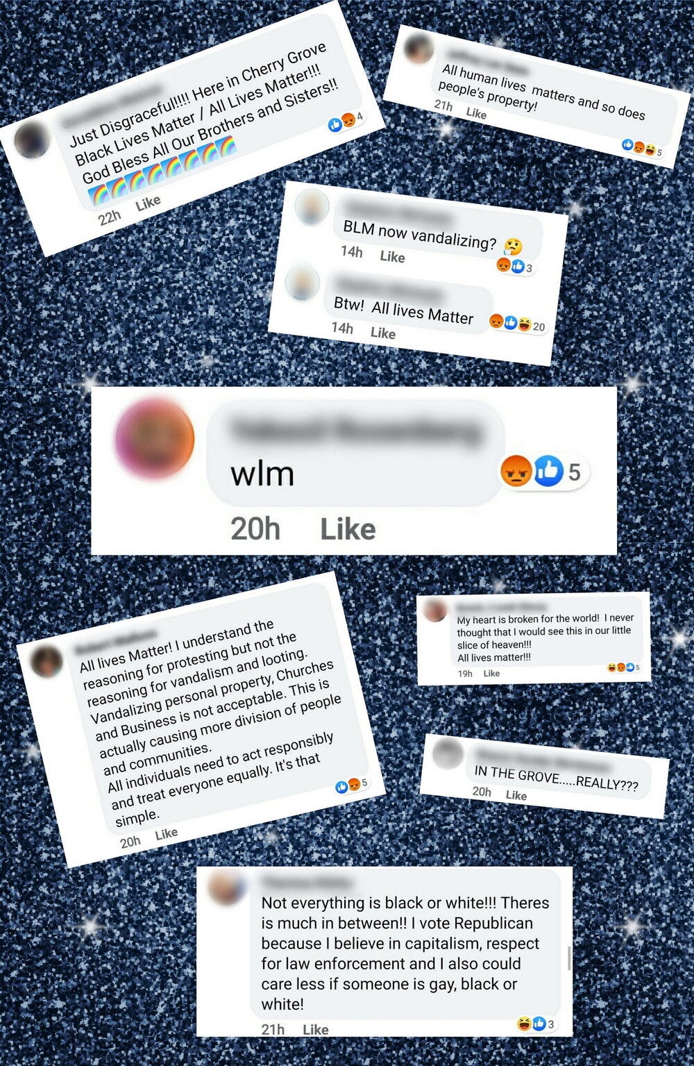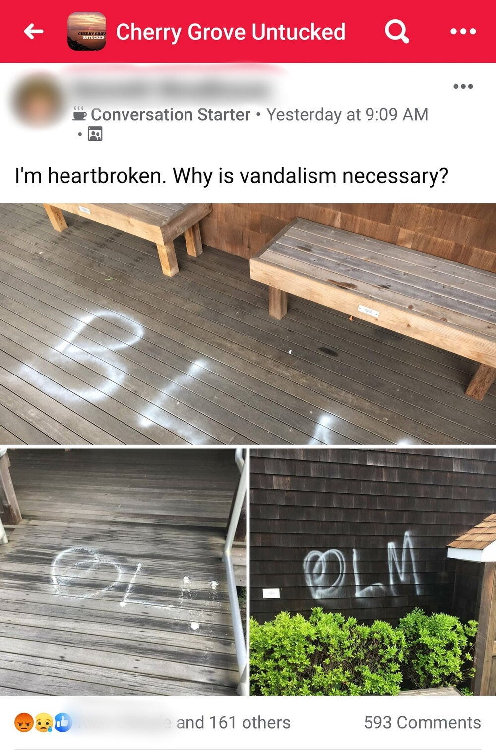 Yesterday morning, in the Cherry Grove Untucked Facebook group, someone posted photos of the Cherry Grove Community Center. Three outdoor areas of the building had the letters “BLM” spray painted on them in white, and the caption to the post read, “I’m heartbroken. Why is vandalism necessary?” This led to a barrage of responses, ranging from those expressing disapproval of the action to those who wanted to explore why someone would be moved to do such a thing in the first place. Some people were quick to blame supporters of the Black Lives Matter movement, while others expressed that this action was juxtaposed to their message and how it must have been someone who wanted to discredit what these recent protests have been all about. Seeing as how a BLM demonstration was scheduled that afternoon in the Grove, this could have very well been the case. What really stood out was the amount of people who came into the comments to say that this particular act of vandalism is precisely why “All Lives Matter”. Numerous people expressed sentiments of shock at seeing the conservative views of people in their beloved Cherry Grove. But for every person who called attention to the vandalism, there were 5 more people who would jump in to pull the focus back to the injustices that black people have experienced in this country for centuries. They reminded them of the lost lives of George Floyd and Breonna Taylor, police brutality and murder, and how all of these things have yet again reached a boiling point that has caused the world to erupt in protest against racism. For those who were focused on property, I offered up a little quip that I have seen floating around social media that I thought could help people shift their perspective;