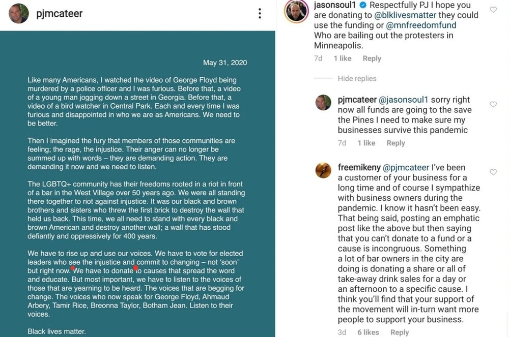 On #blackouttuesday, millions worldwide posted a black square on their Instagram to show solidarity with the BLM movement. Naturally, people had mixed feelings about it. Some said that it made them feel good to see how many people actually gave a damn, while others said that it didn’t serve to really get anything done. Many people and companies also posted who they gave donations to, found entities who could match donations, and called for their followers to do the same. One post that stood out to me was from PJ McAteer. PJ, who, with a business partner, purchased a large strip of the Pines harbor (which includes businesses such as The Blue Whale, Sip & Twirl, The Pavilion, Canteen, and more) for $10mil in 2015, has been giving updates on the status of the Pines amidst the pandemic since late March. A week ago he posted a message that expressed his disdain for the injustices that black people have continually been suffering, reminded his followers about how LGBTQ+ liberation began with a riot, and made a call to action by saying, “We have to donate to causes that spread the word and educate.” When someone followed up in the comments offering him specific organizations that he could donate to, his response was, “Sorry, right now all funds are to the Pines. I need to make sure my businesses survive the pandemic.”